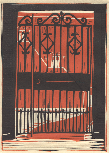 Richard and I just moved from South Beach back to the area I lived in when I first moved to San Francisco, and we first started dating. We’ve been in the new place for a couple weeks now, and it already feels like we’re more in the city than we were before: closer to friends, closer to things to do in the evenings, and more in a neighborhood. I was in the studio on a Wednesday evening, just days before we moved, and I wanted to commemorate our new home. This is what came out. It’s not a literal drawing of the front gate and building, but it sort of takes the elements and rearranges them a bit. It’s one of the first things I’ve done where I just drew directly on the plate before carving, instead of doing a drawing first. Of course, I forgot to reverse it, so I still wound up tracing what I’d drawn, cleaning off the plates, and then re-drawing it. Sigh.