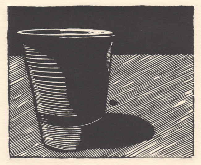 I wanted to practice using lines to describe, rather than outline, shapes and surfaces, so I took a picture of a coffee cup on a sunny day and decided to try and make a print from it. I worked small and (relatively) simple to avoid investing too much time in what is (effectively) a practice piece.