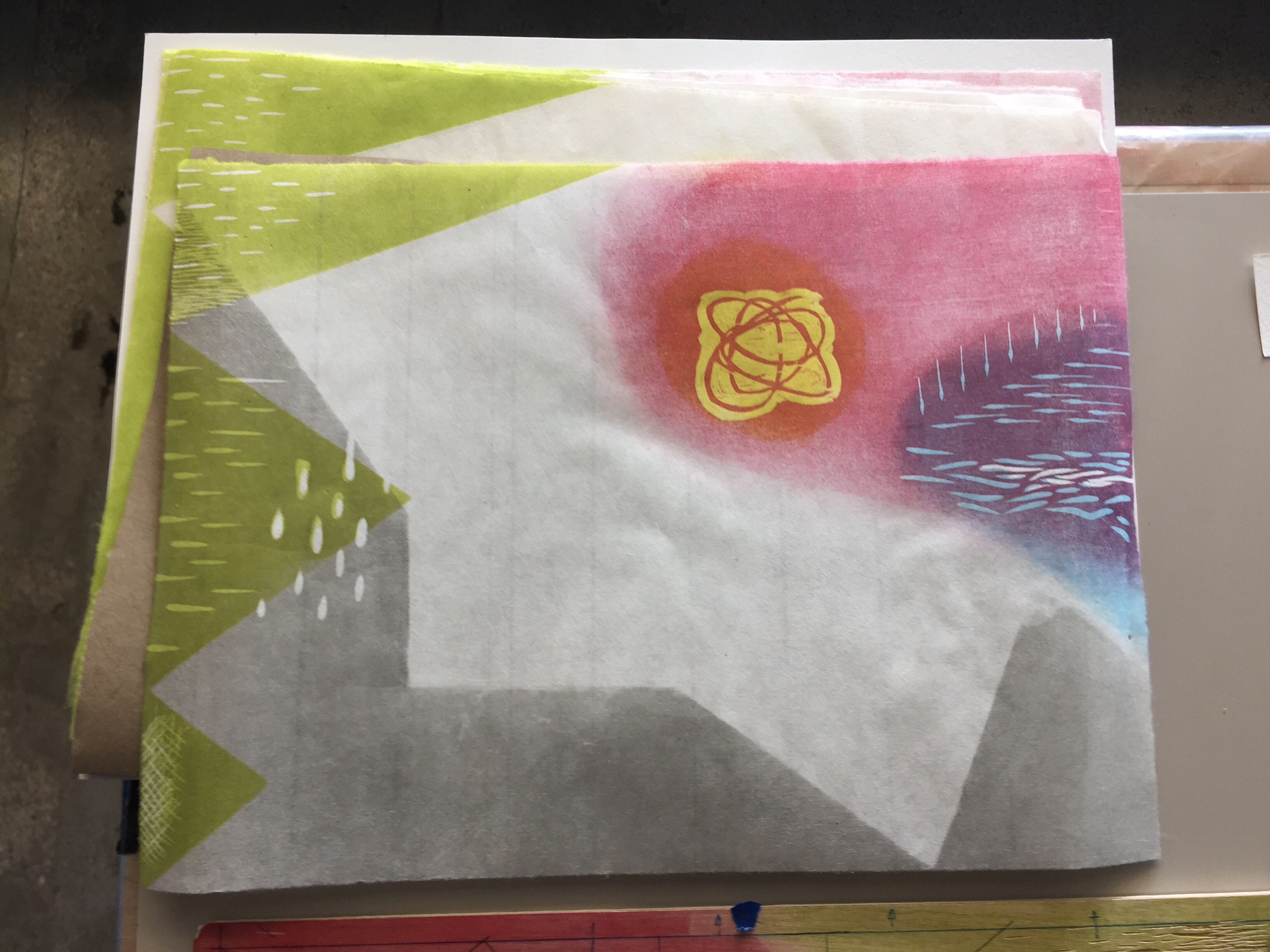 And that leads to the second thing I realized today: flat color is flat. It doesn’t have any energy or movement unless it’s vibrating up against something, or has something layered over it. Working with linocut, I think of color as something that you apply after you’ve made your marks and created the image. With reduction, color is the mark that helps create the image.