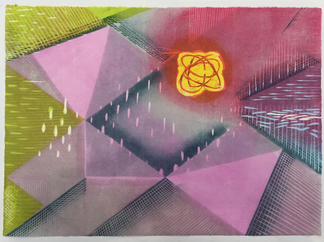 I’m in Nebraska this week participating in the Color Woodcut Printmaking at @constellationstudios today. I finished my first project today. Pretty pleased with the overall result, especially since I don’t normally do abstract. Thanks to @robsnyderorigami for the crease pattern that formed the foundation for this piece. #printmaking #relief #foldandprint #woodcut