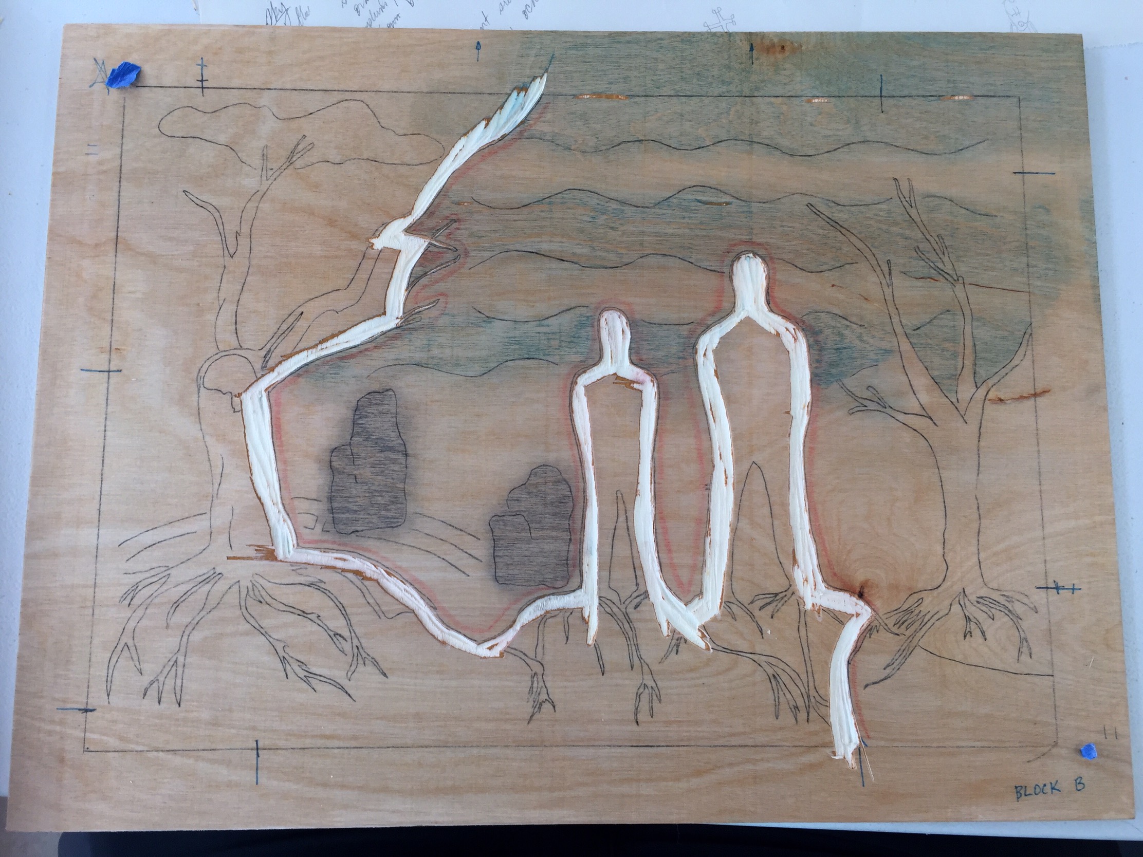I also didn’t take any advantage of the “leftover” material on the second block. For the first pass I carved a “channel” around the parts I wanted to ink or not, leaving behind lots of extra wood. An advantage of this process is that that extra wood can be used to “break” the rules. That is, you have what looks like a normal single block woodcut, but marks show up in areas that have already been reduced, etc. The people in class who used this most effectively were working on abstract pieces where the rule-breaking allowed them to respond to each layer in a way that wouldn’t necessarily be possible without the second block.
