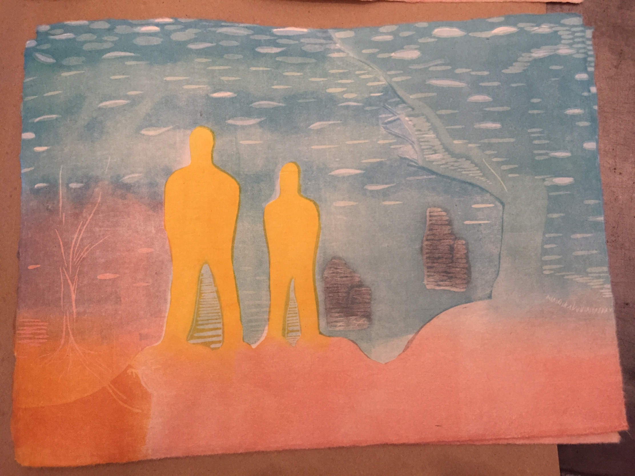 Overall I’m happy with how it turned out. I did another three passes on Sunday to wind up with the final image, meaning that each piece of paper went through the press 12 times. I learned a lot about registration, color layering, and reduction. I also feel like I learned a little about composition.