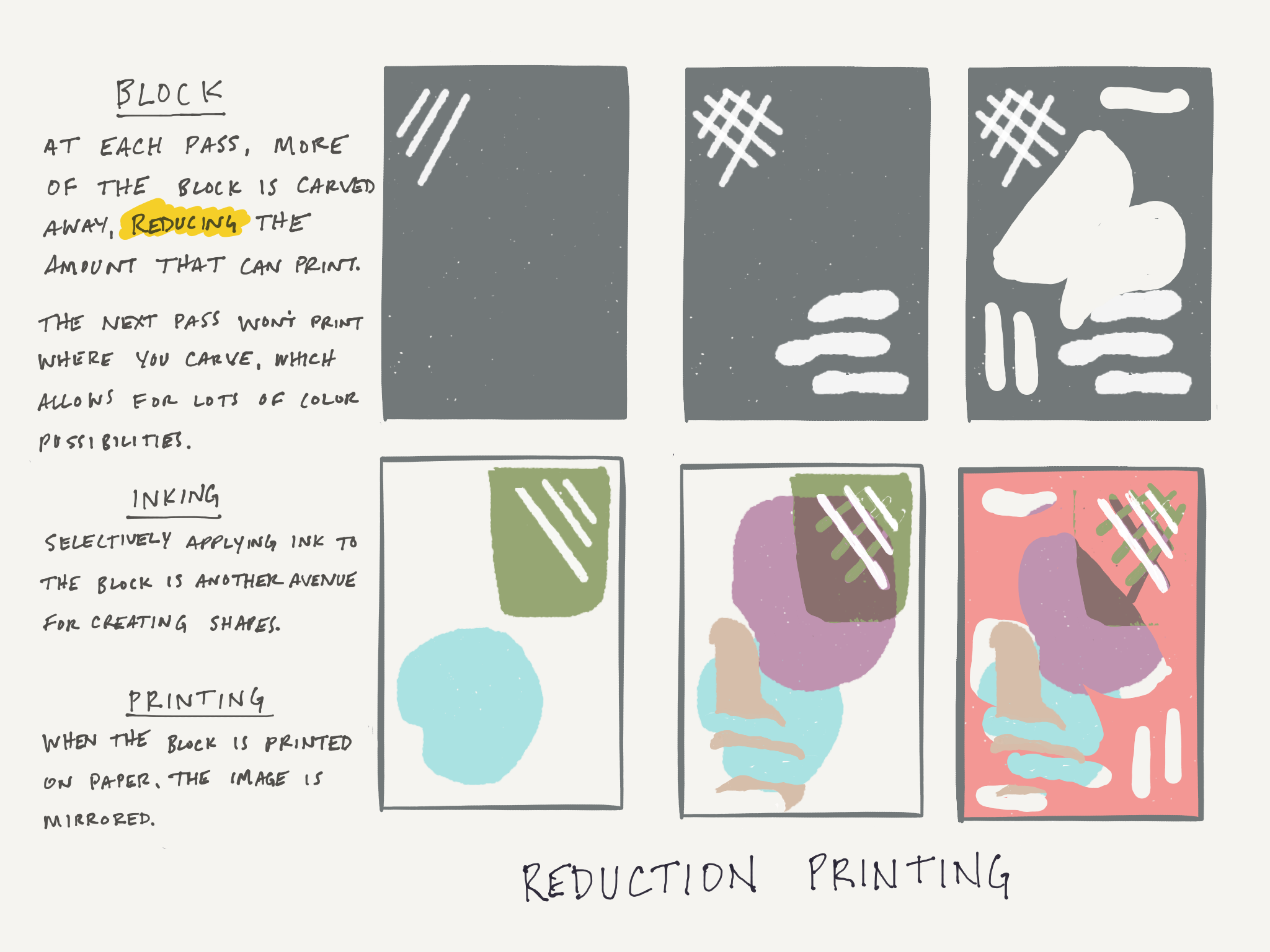 I’ve been experimenting with taking notes and explaining things to myself visually using Paper. Still thinking about my time at Constellation Studios, I tried to draw a simple three-pass reduction print to demonstrate how what you carve away “reveals” the color underneath.